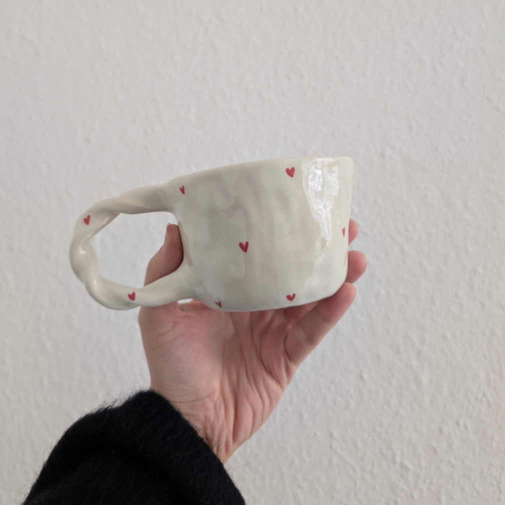 Długo nie mogłam się przekonać do takiego kształtu ucha, ale gdy zrobiłam ten kubek, wiedziałam, że nie może się skończyć na jednym egzemplarzu. Kubek z kręconym uchem z wielkim serduchem w środku, czyż nie jest uroczy?