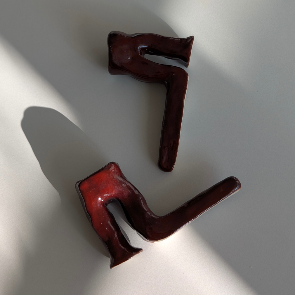 Świecznik w kształcie buta w ciemnym bordowym kolorze. Odcień zmienia się w zależności od światła, co jest widoczne na zdjęciu.